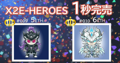 2023/2/19 21:00~ X2E-HEROES 2体同時早押しで販売されましたが、「5ETH」「6ETH」(日本円で100万円以上)という値段にも関わらず即完売となりました。