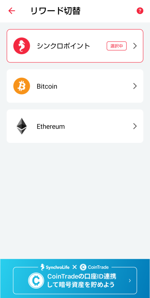 貯める暗号資産はBitcoin、Ethereumに切り替えることが可能です。