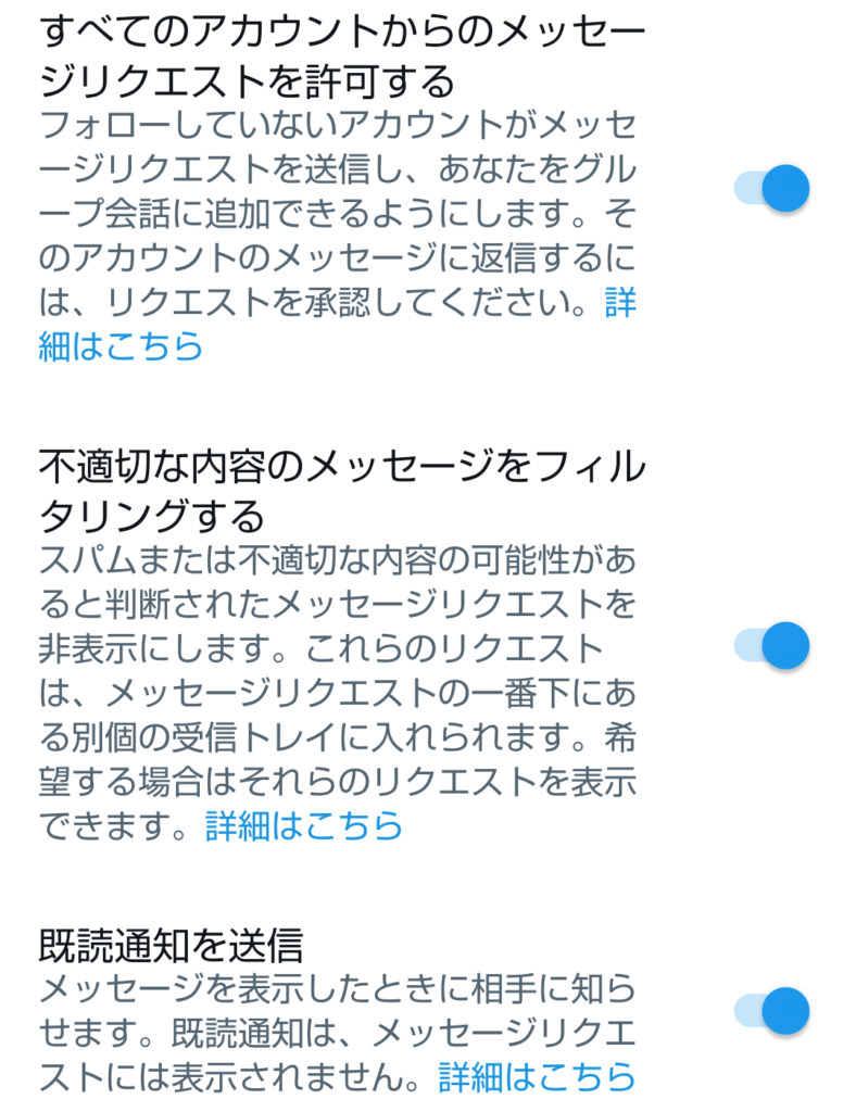 アカウントを作って日が浅い場合、初心者を狙ったフォローしていないアカウントからの詐欺DMばかり届くので、チェックを外しておきましょう。