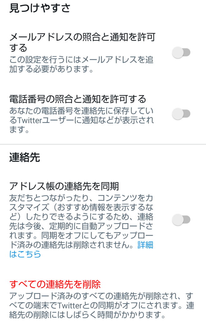その為、知り合いにtwitterを知られたくない人は「すべての連絡先を削除」をした後、全部のチェックを外して下さい。